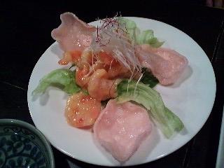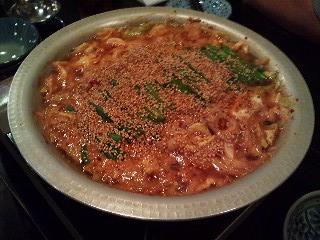 【海老マヨネーズ】と、洗面器みたいな鍋に入った【モツ鍋】