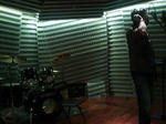 写真は、ドラムセット&録音に緊張気味の旦那(笑)
