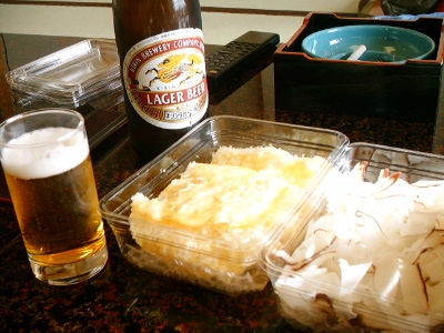 お土産屋で買った珍味をむさぼりながら、昼ビール(笑)