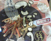気付いたら、6時でした 多分、日中に飲んだ大量のコーヒーとコーラのせいさ~ 全然眠くなんないんだもの~カフェインってすごいね おかげ様で、かなりの寝不足ちゃんでございます・・・。 さて、昨日はテイクの練習 ライブ前、ラストでしたが、中々だったのでは 久々のライブ楽しみです 練習が終わり、帰ってテレビつけたら ギ○ル曽根ちゃんが、寿司食べてました。 あぁ…寿司食べたい…。 そして、朝○テレビを見ると、スシ王子 おぉ~追い討ちか? 寿司食べたいな~と思いながら、晩酌のお供。 ごぼうスナック(香りを味わうごぼうのおいしさ) すげ~ごぼう風味でした 本格的