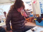 緑の帽子とお揃いの、緑のカキ氷食べる、弘嗣兄さん。