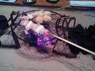 囲炉裏で焼き物を焼きながら、蕎麦を待つ。