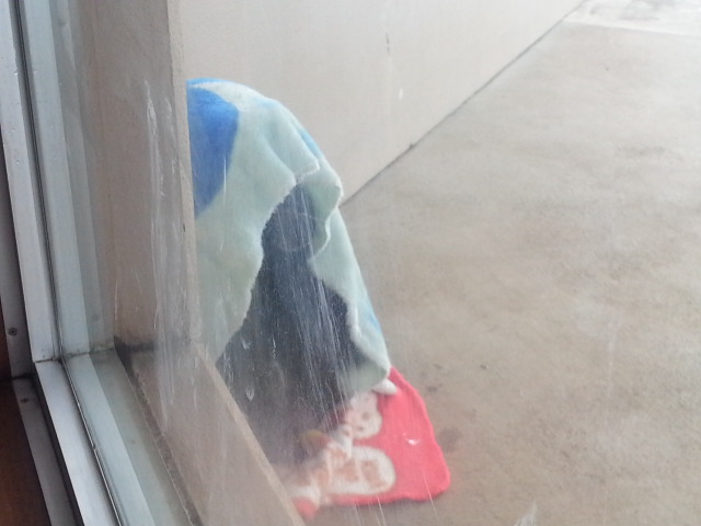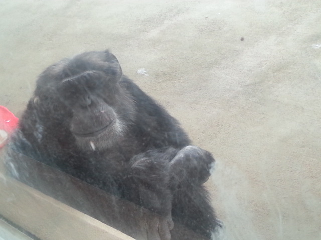 毛布取られて寒そうなチンパンジー。