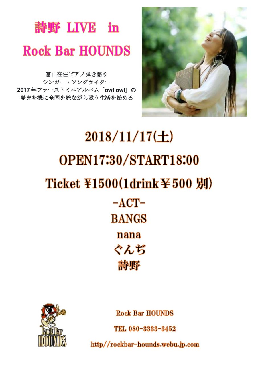 11/17(土)、富山在住のシンガーソングライター・詩野さんのライブがあります!