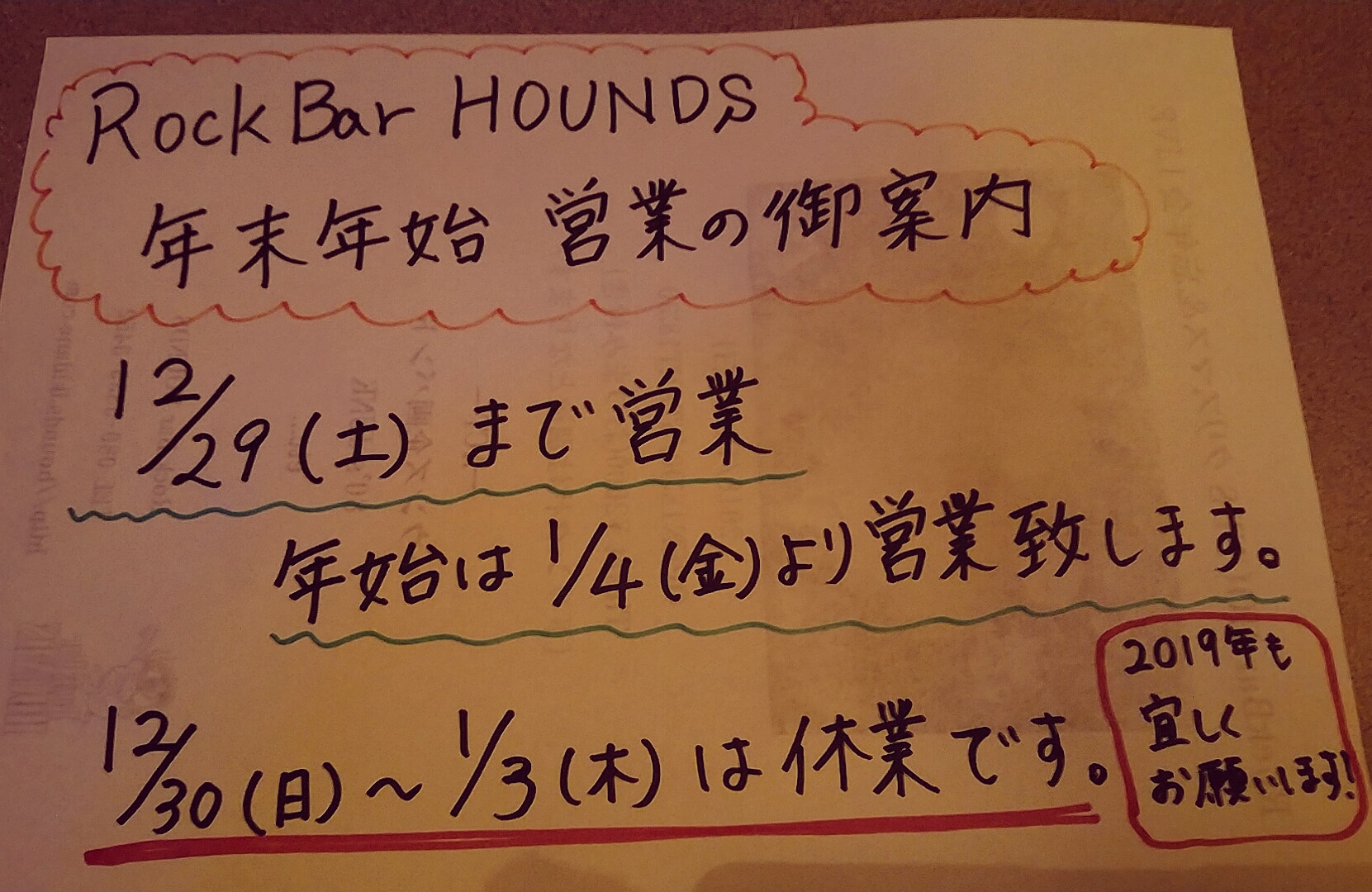 ハウンズ年末年始営業日の御案内。